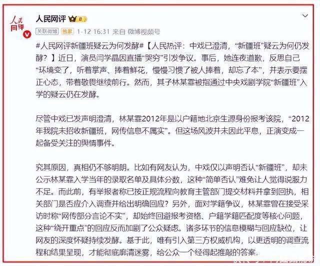 正所谓“多言买祸”体育游戏app平台,这句话用来描摹演员闫学晶近期的际遇,实在是再贴切不外了。 只是因为在直播间里的几句“哭穷”言论,这位也曾深受不雅众谨防的“二东谈主转女王”,便将我方推向了公论的风口浪尖,多年来艰苦成就的不雅众缘险些毁于一朝。 更令东谈主始料未及的是,这场风云的火势扩张之快,不仅烧掉了她登上辽宁春晚的可能性,还将她32岁的男儿林傲霏也卷入了一场对于高考“特权”的庞杂争议之中。 而当央媒东谈主民网王人躬行下场,发表长文公开点名分析此事时,通盘东谈主王人强项到,这件事情的背后,远比联想中要复杂得多。 从“晚节不终”到“娘错儿担”:一场直播激发的四百四病 在此次风云爆发之前,闫学晶在不雅众心中的形象一直颇为正面。 她从东北的二东谈主转舞台一谈打拼,凭借在《刘老根》中的“山杏”一角红遍大江南北,之后更是屡次登上春晚舞台,与冯巩等笑星搭档,留住了不少经典小品。 她身上那股子晴朗、接地气的炊火气,让她在庞大演员中独树一帜,深受中老年不雅众的谨防。然则,这一切的好意思好形象,王人因她在直播中的几句话而轰然倒塌。 2025年12月29日的这场直播,本来是闫学晶和360多万在线粉丝唠家常的方位,没成想却酿成了“翻车现场”。 直播里,她眉头紧锁,一脸憋闷地跟粉丝颓唐,说我方男儿林傲霏一年最多只可拍一部戏,挣几十万。儿媳妇唱音乐剧,一年挣不到十万。 接着她就掰入辖下手指头算支出:在北京住中档小区,房租一个月两三万;孙子上私立幼儿园,一年膏火四十万。 再加上请保姆、情面交游这些支出,终末转头说“一年如果莫得个百八十万,这日子根底撑不下去”,说完还抹了眼泪,以致埋怨粉丝“不懂北京的消费有多高”。 这些话一出口,网友们平直炸了锅。巨匠盛怒的不是她有钱,而是她脱离推行的“哭穷”。 要知谈,平庸老庶民一家三口一年挣五六万王人能过日子,她男儿儿媳年入几十万,还说日子过不下去,这让平庸东谈主若何秉承? 更让东谈主反感的是,她哭诉“没钱”的工夫,身上穿的是几万块的名牌大衣,手腕上戴的是欧米茄名表,满身凹凸珠围翠绕,小数王人看不出拮据的神情。 跟着公论发酵,网友们开动深扒她的果真情况,这一扒才发现,闫学晶根底不缺钱,反而身家丰厚。 她名下有北京、三亚多处豪宅,总价值几千万;2021年给男儿办婚典,破耗两百多万,时局奢华。 她接一条告白报价即是12万,拍一条告白的钱,就够孙子一年的幼儿园膏火了。 之前她还说过“穷是因为懒”“老农民种地一年也能挣一二十万”这种雷东谈主言论,刻下再看她的“哭穷”,就更让东谈主以为讥笑。 值得一提的是,这场“哭穷”风云的影响远超预期。 短短几天,闫学晶掉粉九万,融合的品牌纷纷紧要评估解约,连她终年亮相的辽宁卫视春晚,也把她的名字从节目单上移除了。 要知谈,她从2001年首登央视春晚后,就成了辽视春晚的“老面目”,每年的节目王人是不少家庭的“年夜饭配景音”。 如今却因言论不当错失这个舞台,可见不雅众缘流失得多严重。 比我方“晚节不终”更严重的是,闫学晶还在直播满意外间知道了男儿的高考经历,把32岁的林傲霏也拖进了争议里。 她随口说“新疆分低,我男儿就考的阿谁”,这句话平直让林傲霏堕入了“占用高考特权”的公论旋涡。 了解情况的东谈主王人知谈,“新疆班”这类专项招生磋磨,是国度为了扶抓边域少数民族艺术东谈主才建造的战略,有严格的阅历戒指: 往往要求考生必须是新疆户籍、有新疆高中学籍,还要在新疆相聚就读满三年,何况仅限少数民族考生报考,每年寰宇只招二十东谈主足下,限额至极畸形。 但林傲霏是吉林籍汉族,从小在北京长大,户口也在北京,满盈不妥当“新疆班”的报考条目。 一个北京籍的汉族考生,若何能通过新疆的低分战略上中戏?这个疑问让网友们的质疑声越来越大。 之后,中央戏剧学院发布声明判辨,说林傲霏2012年所以北京户籍考生身份报考的中戏,被登第到扮演系平庸本科班。 学校还说2012年中戏根底没招收新疆班,网传讯息是假的。可这份声明不仅没平妥契约,反而让公论更热烈了。 直到2026年1月12日,央媒东谈主民网躬行下场发表长文点名分析此事,才让巨匠看清了问题的中枢。 东谈主民网的著作里明确指出,公论迟迟不用的中枢原因是“真相不够晴朗”。 中戏的声明诚然有公信力,但只是否定了林傲霏通过新疆班入学,并莫得公示往日的登第名单和林傲霏的高考分数。 对群众来说,光有否定不够体育游戏app平台,惟一看到实实在在的把柄,才智果真驯顺。 著作还点出了网友盛怒的裂缝:巨匠盛怒的不是林傲霏的气魄,而是对“进修平正”的寻衅,是对“特权”的反感。 濒临越来越大的公论压力,1月11日晚,闫学晶在微信一又友圈发布手写谈歉信,坦言我方“念念想跑偏”“忘了本”,字里行间尽是不振。 第二天,男儿林傲霏转发了谈歉信,还配文“娘的错,男儿担”,想展现担当。 但这份迟来的谈歉并莫得换来公众的包涵,巨匠以为谈歉赤忱不及,避重逐轻,通篇只提我方忘本,对男儿入学是否违纪的中枢问题只字未提,昭彰是想模糊焦点。 而如今东谈主民网的点评,不仅是针对闫学晶子母,更是在敲打通盘公世东谈主物。 算作公世东谈主物,享受着高收入和高关心度,更应该拘谨我方的言行,尊重平庸东谈