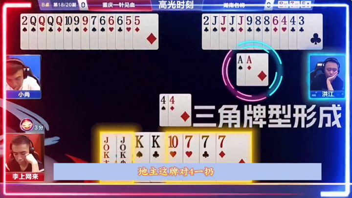 田主这牌对4一扔,酿成一个尽头范例的三角牌型,看有莫得契机过单。10上家农民扛的尽头到位,可是上家农民这牌全齐受控。这牌如何行牌?一张单24带2吗?这牌打的真好,4带两对。当前田主对k明大,可是视角当中还俩断章。这牌嗅觉应该是炸不太动,不一定敢炸。不外站在天主视角中来看,田主这个牌还真有点契机,仅仅不知说念能不成打出来。径直遴荐开炸,3带对打的真好。锁定胜局。