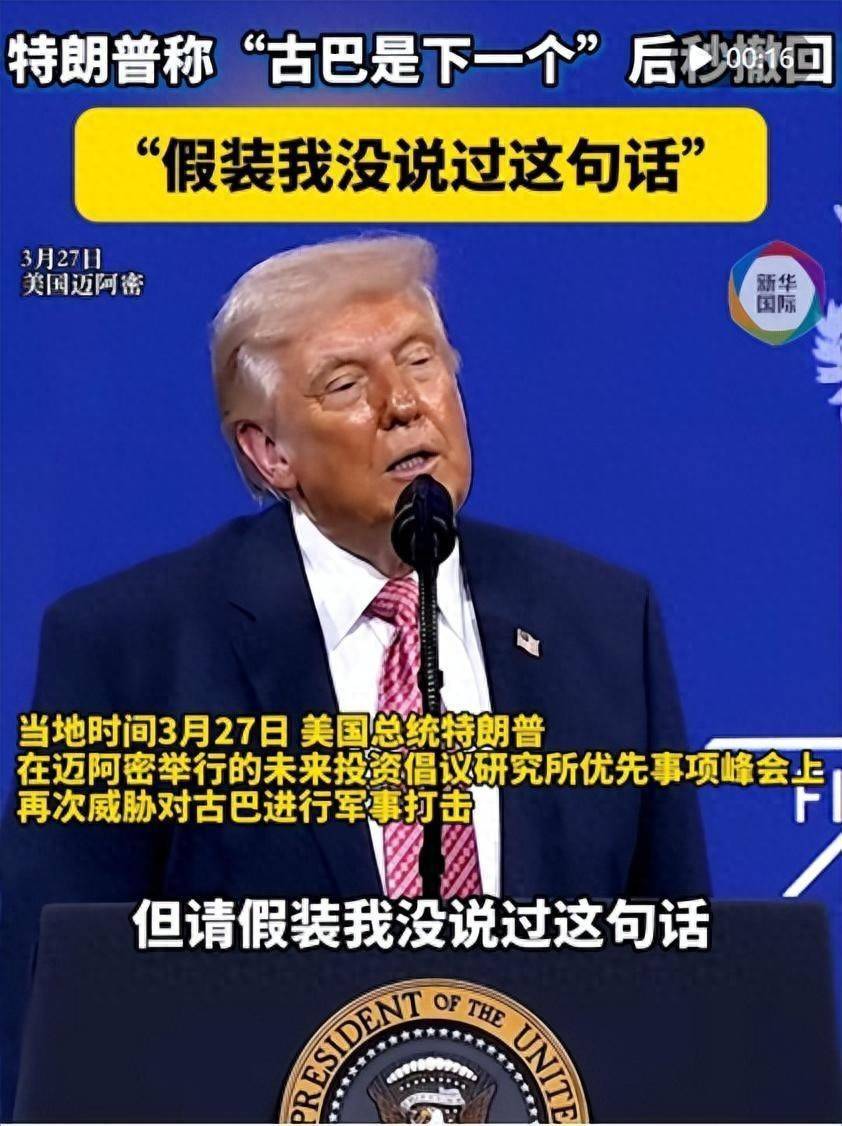 特朗普今日在佛罗里达州迈阿密举行的一场会议上说:“趁机提一句,下一个是古巴……极度感谢。古巴是下一个。”